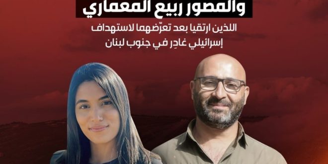 أصدرت نقابة محرري الصحافة اللبنانية بيانا ،أشارت فيه الى انها تلقت “النبأ المفجع بإستشهاد مراسلة قناة “الميادين” الزميلة فرح عمر ومصورها ربيع المعماري في اعتداء اسرائيلي غادر ومباشر في غارة جوية على مثلث طير حرفا -الجبين”.