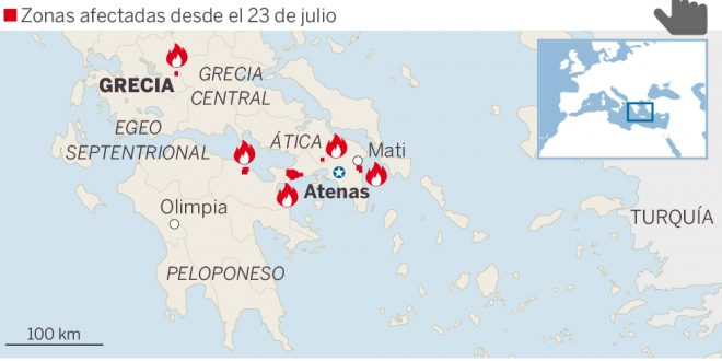 La peor tragedia natural en la historia reciente de Grecia ha dejado desde el lunes al menos 74 muertos y más de 180 heridos tras el paso de una lengua de fuego por el norte y noroeste del Ática, la región que rodea la capital griega. Todas las víctimas, entre las que hay adolescentes, niños e incluso un bebé de seis meses, han sido halladas en el área comprendida entre el puerto de Rafina, a unos 30 kilómetros de Atenas, y Nea Makri, unos diez kilómetros más al norte, con la zona cero localizada en Mati, una típica localidad balnearia muy frecuentada por los locales.