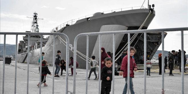 Detrás de él reposa imponente en el puerto de Mitilini el buque L177, de color gris plomo y reconvertido en una especie de campo de refugiados flotante, cuya puerta trasera sigue abierta desde el pasado miércoles. El día en el que las autoridades griegas empezaron a embarcar a unos 500 migrantes llegados a las islas griegas después del 1 de marzo, con el objetivo de trasladarlos al continente. Nada ha pasado desde entonces. Ni se ha permitido que el grupo pueda pedir asilo –una violación del derecho internacional– ni el barco ha partido, como las autoridades habían dado a entender que se haría “en dos o tres días”.