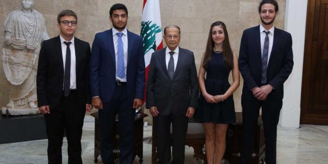 والتقى الرئيس عون الطلاب الاربعة في قصر بعبدا صباح اليوم، قبيل سفرهم الى فرنسا، بحضور رئيس الجامعة اليسوعية الاب البروفسور سليم دكاش يرافقه عميد كلية الهندسة الدكتور فادي جعاره ومدير قسم المرحلة التحضيرية الدكتور مروان بروش.
