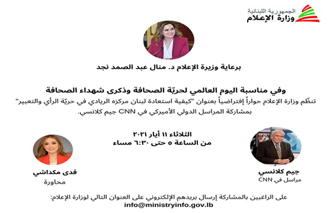 دعت وزارة الإعلام، الإعلاميين وطلاب الإعلام الى حوار افتراضي بعنوان “كيفية استعادة لبنان مركزه الريادي في حرية الرأي والتعبير”، برعاية وزيرة الإعلام في حكومة تصريف الاعمال الدكتورة منال عبد الصمد نجد، ومشاركة المراسل الدولي الأميركي في CNN جيم كلانسي، غدا الثلثاء، من الخامسة حتى السادسة والنصف مساء.