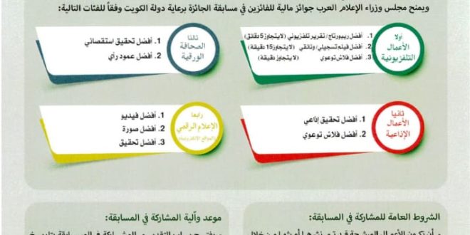 وأعلنت الوزارة، أن “الجائزة ستمنح لمؤسسات الإعلام العربية الرسمية أو المعتمدة رسميا او الخاصة سواء أكانت مقروءة أو مسموعة أو مرئية او المواقع الالكترونية المعتمدة رسميا من إحدى الدول العربية الأعضاء.