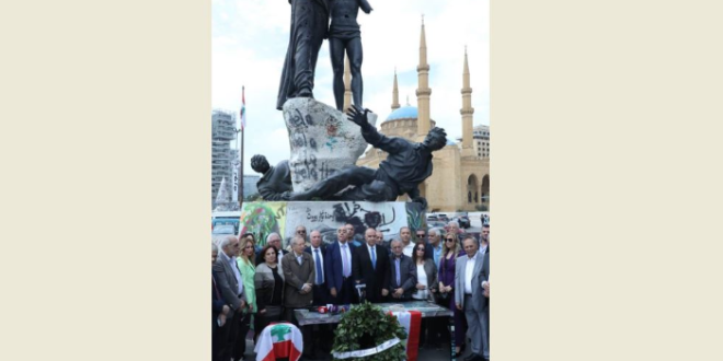 أضاف: نحن في ساحة الشهداء، هذه الساحة التي انطلقت منها الحرية في 6 ايار 1915، ومن ثم كل شهداء الصحافة الذين سقطوا من أجل لبنان”.