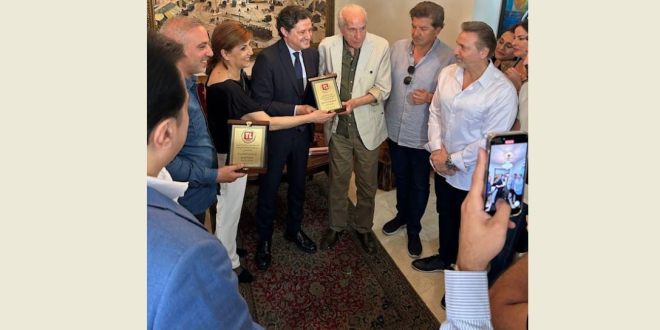 وبحث وزير الاعلام مع المكرمين وضيوفهما في سلسلة مواضيع فنية واعلامية وثقافية .