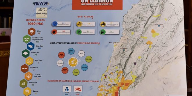 وتتضمن الخريطة التي عرضها بري على سيجورنيه الاضرار التي ارتكبتها اسرائيل في تدمير الآلاف من المنازل والمحال التجارية والمؤسسات الاقتصادية والصناعية، فضلا عن تخريب مساحات شاسعة من اشجار الزيتون والفاكهة والخيم الزراعية التي تضررت، الى بساتين الموز والحمضيات في الناقورة وساحل صور. ولم تستعمل اسرائيل هذه المرة اسلحة تقليدية بل لجأت الى اطلاق قنابل فوسفورية محرمة دوليا وتخلّف آثارا لسنوات طويلة على المساحات الحرجية والزراعية، فضلا عن انعكاسها السلبي على الآبار والمياه الجوفية.