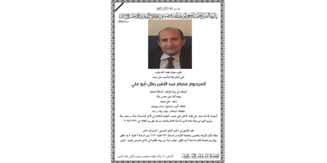 يقام مجلس عزاء عن روحه الساعة الثالثة بعد ظهر يوم الجمعة المقبل، في النادي الحسيني الجديد – الدوير.