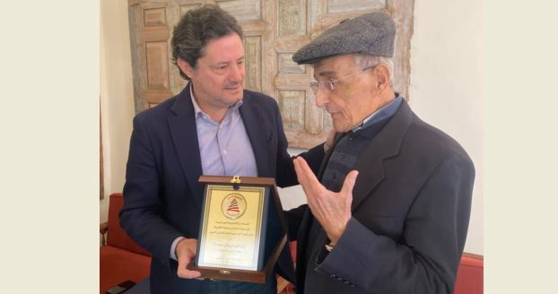 كرم وزير الاعلام في حكومة تصريف الاعمال المهندس زياد المكاري، الشاعر الزجلي شيبان سعادة في دارته في زغرتا، في حضور مختار بلدته أصنون – زغرتا انطونيوس الخواجة والاعلاميين مرسال الترس وروبير فرنجية.