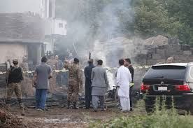 A statement of the Pakistani military announced on Tuesday that a military aircraft had crashed early in the morning in a built-up area in the garrison city of Rawalpindi killing all five crew members and 12 civilians and setting off a blaze that left a pile of smoking rubble.