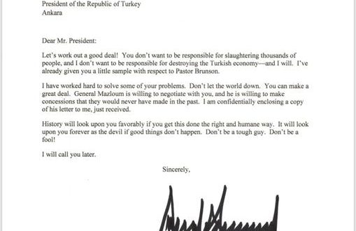 “Let’s work out a good deal!” Trump said. “You don’t want to be responsible for slaughtering thousands of people, and I don’t want to be responsible for destroying the Turkish economy – and I will.”