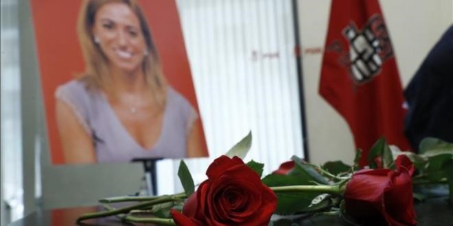 -FOTODELDIA- GRA127 MADRID 10 04 2017 -Rosas rojas y un retrato de Carme Chacon exministra socialista de Defensa y exvicepresidenta primera del Congreso que fallecio ayer en Madrid a los 46 anos en la sede del PSOE donde ha quedado instalada la capilla ardiente de la exdirigente socialista EFE Emilio naranjo