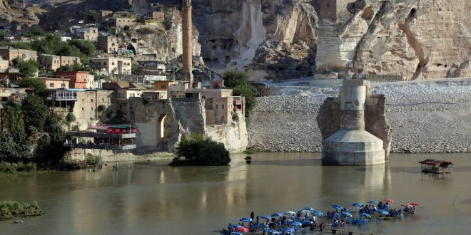 La localidad, en el sureste de Turquía, aparece tras doblar un meandro del Tigris, río que ha conocido tiempos mejores y desde hace décadas discurre con un caudal ínfimo respecto a lo que fue: una vía fluvial navegable. El valle en ese punto se ensancha y surge un castillo natural, un peñón de roca que se eleva 100 metros sobre el agua, horadado por túneles medievales y cuevas aún más antiguas. Desde la ciudadela sobre ese peñón hasta el río se desparrama por la ladera contigua una localidad abigarrada que mezcla antiguas construcciones de piedra con modestas casas de cemento de colores y en la que resaltan minaretes árabes y túrquicos, restos de iglesias armenias y siríacas, hamames… Hay, había, también un mausoleo erigido por la dinastía turcomana de los Akkoyunlu cuya fina decoración en azulejos recuerda a la arquitectura de Samarkanda.