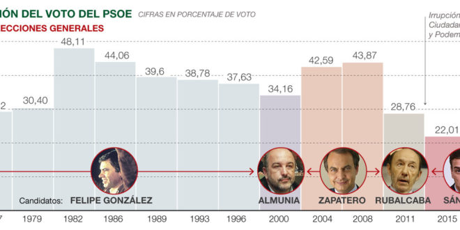 Desde que González se retiró en 1997, el PSOE ha ido dando tumbos sin líder y sin proyecto. Le sucedió Joaquín Almunia, que perdió las elecciones del 2000 (mayoría absoluta de José María Aznar) y sacó 125 diputados, no solo sin un competidor tan fuerte en el mismo espacio como ahora es Podemos, sino aliado con la Izquierda Unida (IU) de Francisco Frutos.