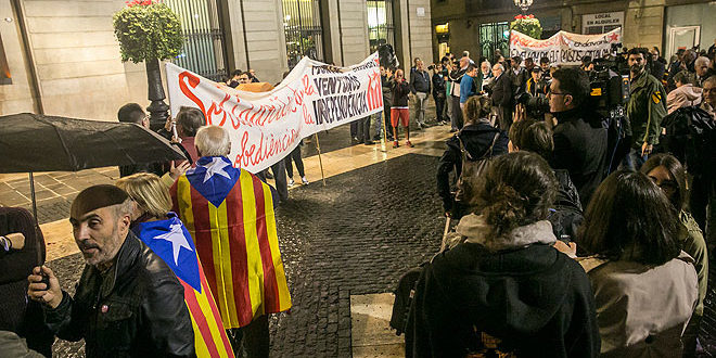 Y, como una imagen vale más que mil palabras, cabe recordar que en un reciente acto de apoyo a Carme Forcadell en el Parlament, el portavoz de Junts pel Sí, Jordi Turull (PDC), bromeó cogiendo uno de los carteles de la CUP que rezan “‘sense por, desobeïm per la independència'”, si bien dobló el cartel para que no se viera la segunda parte de la frase tras el “sin miedo”. Un Turull que, por cierto, y como muestra del ambiente enrarecido que se respira en el secesionismo, fue recibido con silbidos en Berga, en la concentración de protesta por la detención.